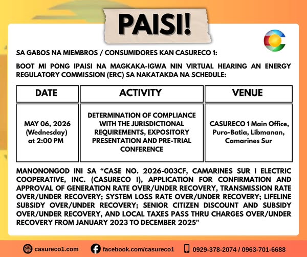 𝐖𝐇𝐀𝐓: ERC CASE NO. 2026-003CF, CAMARINES SUR I ELECTRIC COOPERATIVE, INC. (CASURECO I), APPLICATION FOR CONFIRMATION AND APPROVAL OF GENERATION RATE OVER/UNDER RECOVERY, TRANSMISSION RATE OVER/UNDER RECOVERY; SYSTEM LOSS RATE OVER/UNDER RECOVERY; LIFELINE SUBSIDY OVER/UNDER RECOVERY; SENIOR CITIZEN DISCOUNT AND SUBSIDY OVER/UNDER RECOVERY, AND LOCAL TAXES PASS THRU CHARGES OVER/UNDER RECOVERY FROM JANUARY 2023 TO DECEMBER 2025
